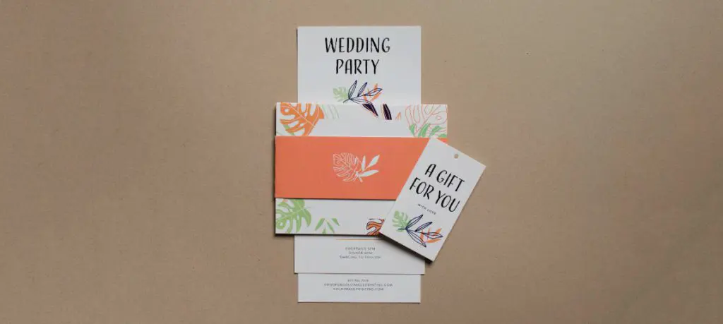 Packaging sleeves are also called belly bands because they don’t always go with a packaged good. They also go nicely with stationary. Packaging sleeves wrap beautifully around a set of wedding invites. Our wedding printing services are almost endless. Your wedding suite may include wedding invitations, RSVP cards, RSVP envelopes, direction cards, registry cards and much more. Bind these sweetly together with a beautiful packaging sleeve or wedding belly band. This belly band will match your color and theme. Made from the same paper stock as your other wedding set paper, your guests will be able to organize the set nicely.